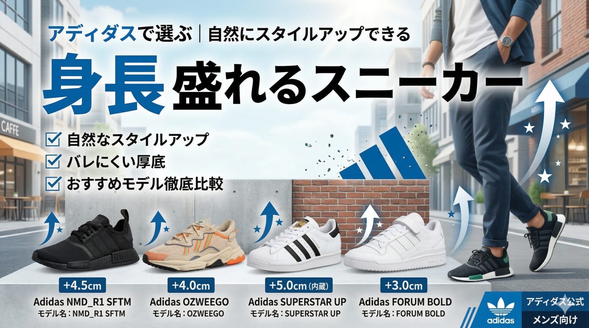 アディダスで身長が盛れるスニーカーを選ぶなら、厚底の高さだけで決めず、自然見え・合わせやすさ・履く場面まで含めて選ぶのがいちばん失敗しにくいです。